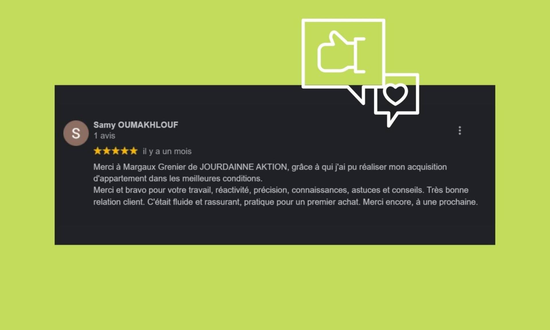 "Merci à JOURDAINNE AKTION, grâce à qui j'ai pu réaliser mon acquisition d'appartement dans les meilleures conditions.